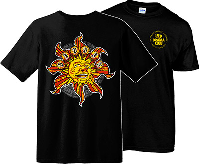 Painting was then modified digitally to extend the sunrays and to reduce the color depth for printing in 3 colors on the back of black t-shirts.